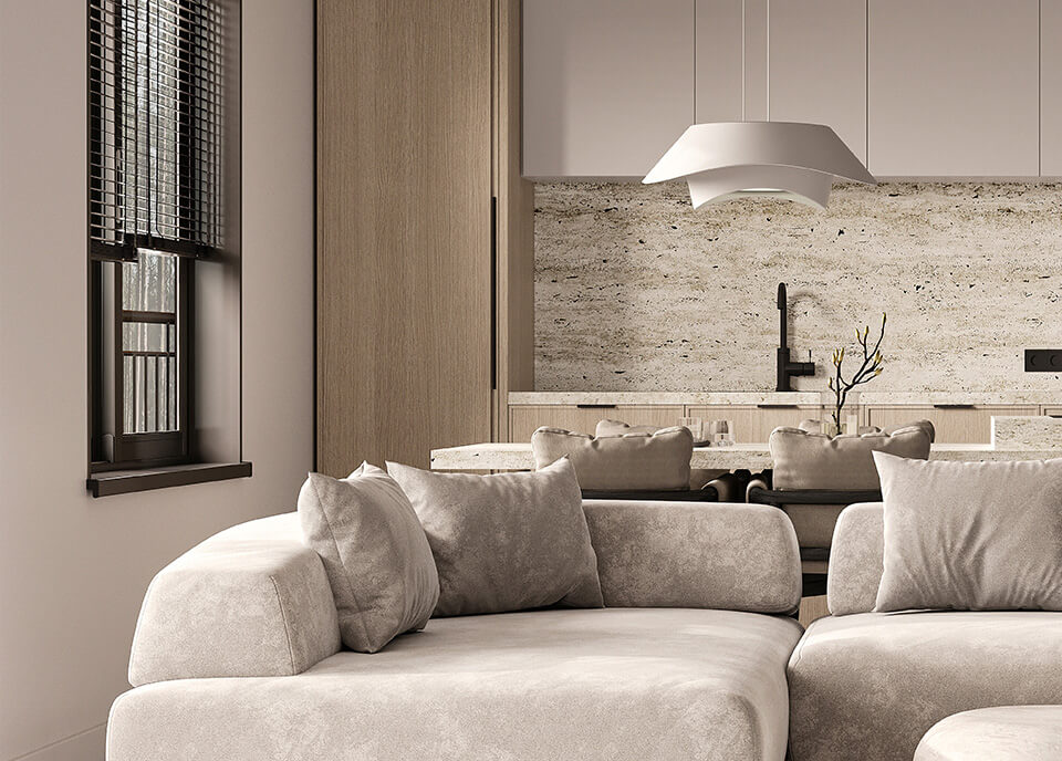 Inspiration for a living room with a sofa, wood table and pillows (Demo)